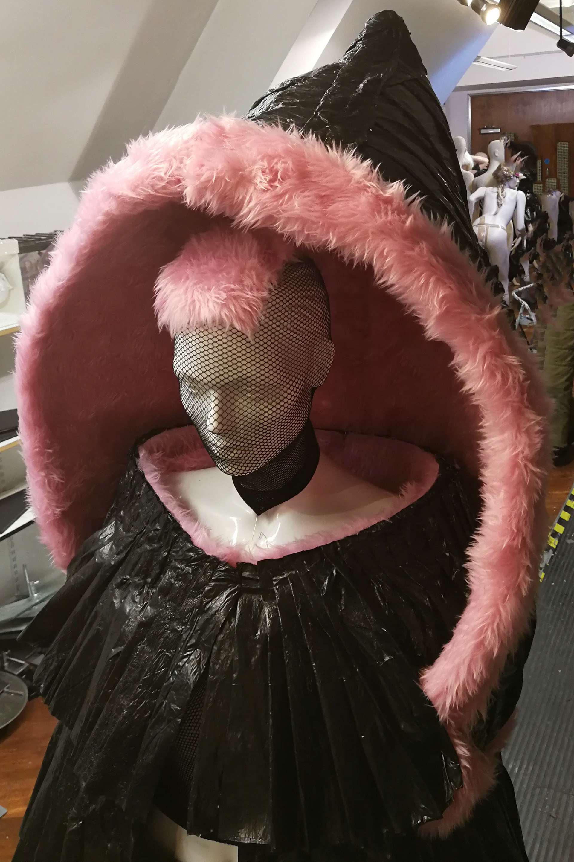 As we looked at Japanese culture we came across the head-wear worn by Japanese brides during traditional Shinto wedding ceremonies. We thought that recreating something like that would add an air of majesty to the mannequin and make it more interesting. The hood was made from scratch using chicken wire and modroc, we then covered the top of it with bin liner strips and added bright pink fur on the inside for a bold, dramatic effect.