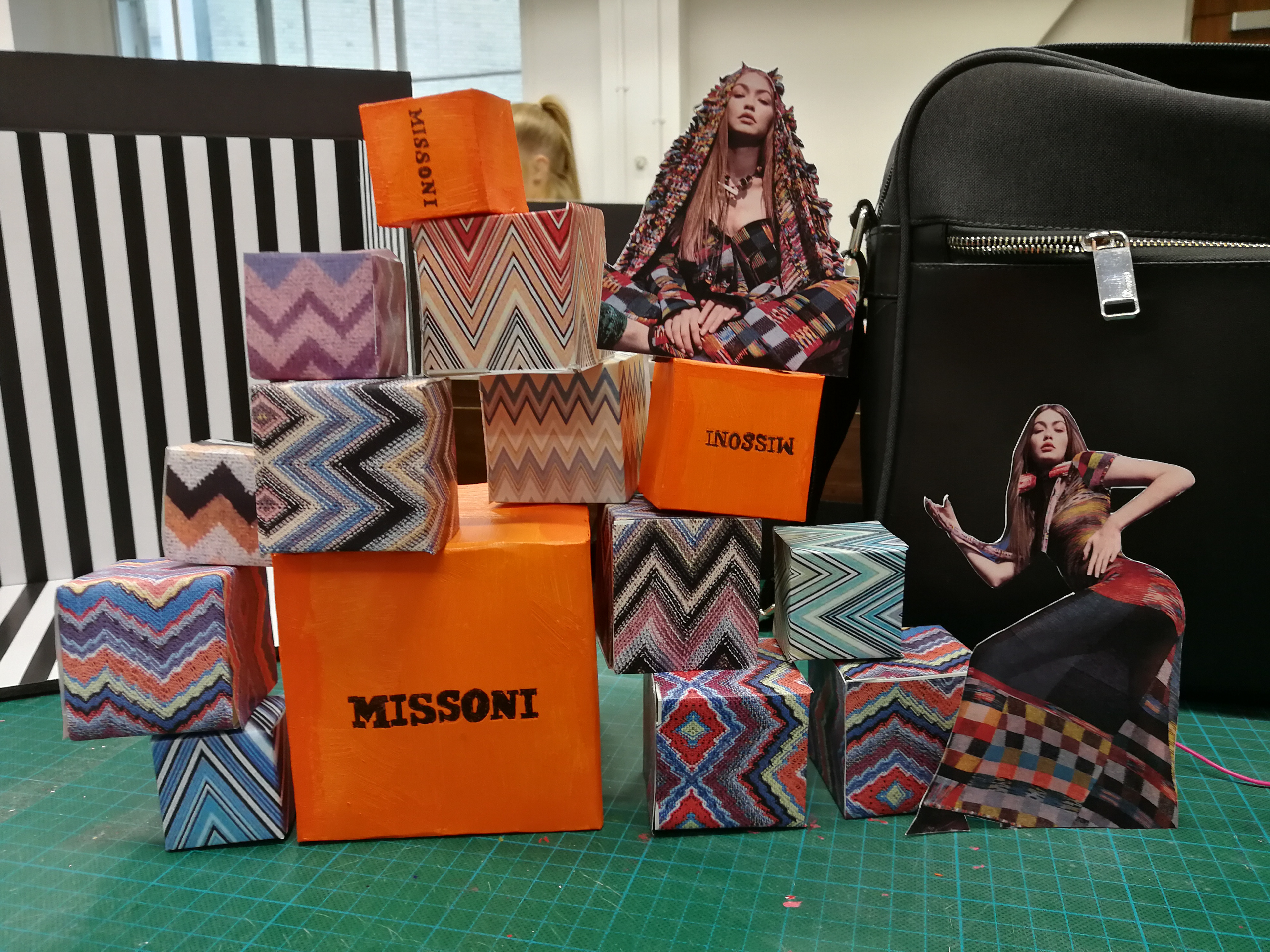 We created boxes in a variety of sizes using different Missoni chevron prints and the colour orange which, like the chevron, features heavily in Missoni's branding. We also decided to add black and white stripes in the background of the window to create an interesting optical illusion that would stop the window from being overwhelmingly colourful.