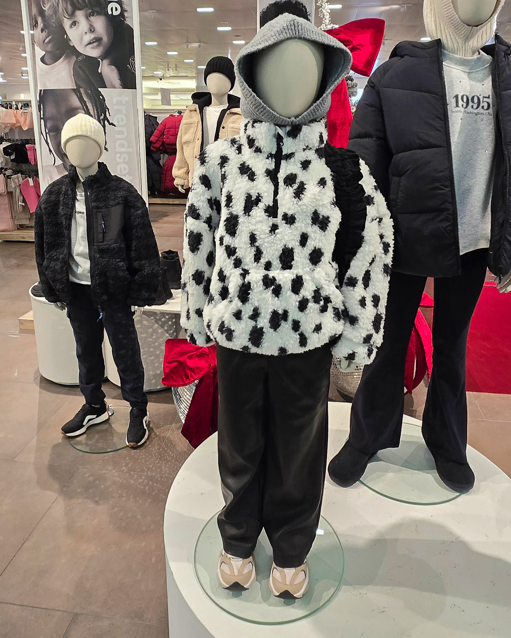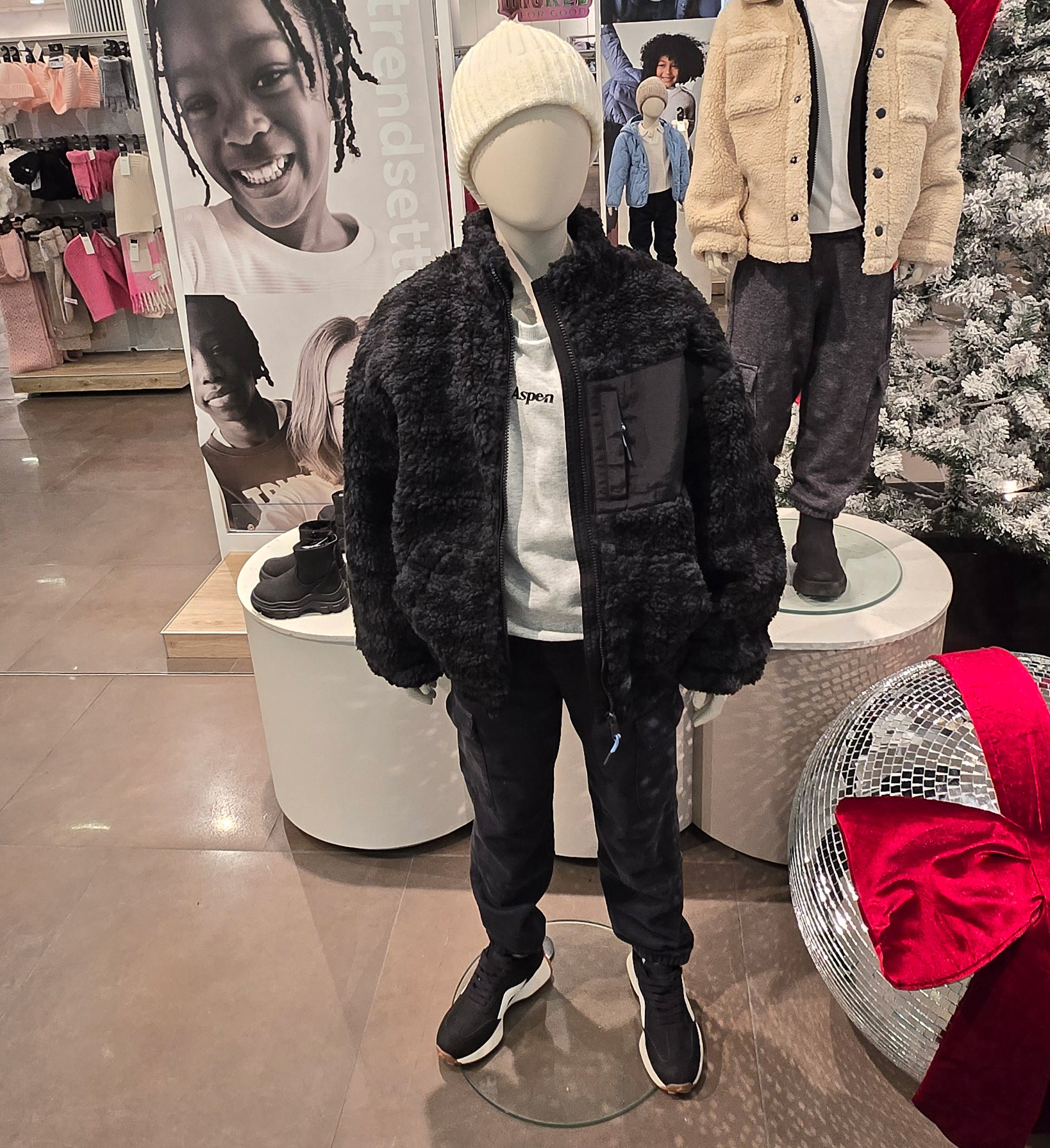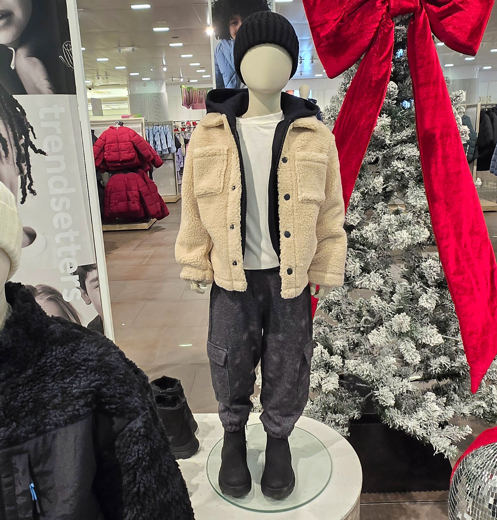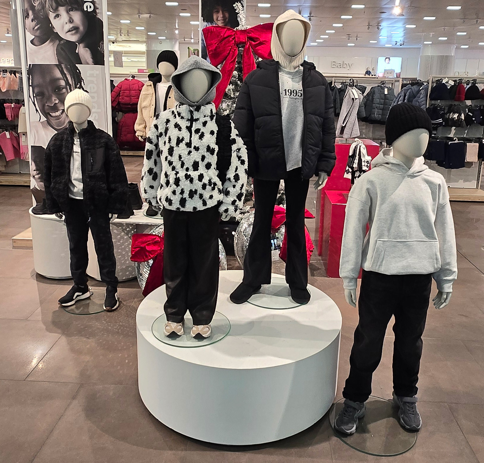 This display was for the December refresh of the M&S kidswear mannequin display, following on from a vibrant and festive Christmas installation. The concept focused on monochromes, tactile fabrics, and layered textures to evoke a cosy, comfortable, and winter-appropriate look and feel. The styling aimed to balance warmth and practicality with a modern, clean aesthetic, ensuring the display felt inviting while remaining commercially relevant for the post-festive trading period.