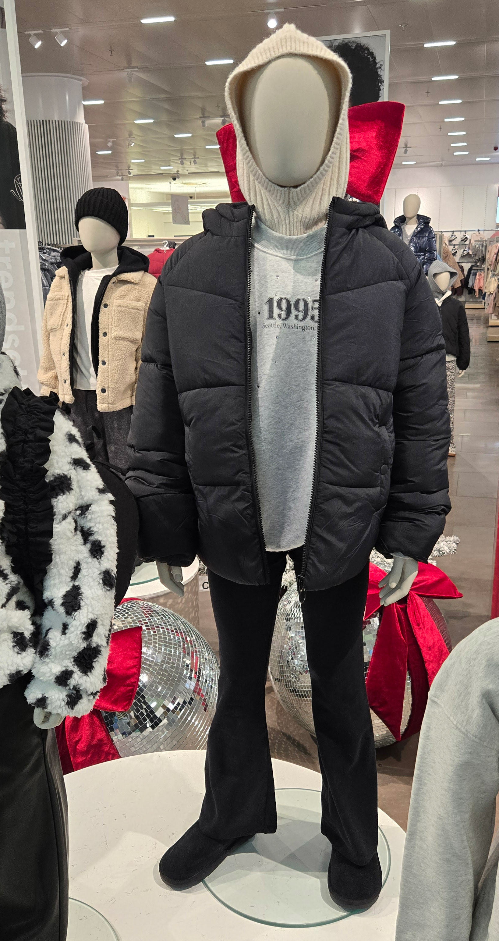 Due to limited product availability, four of the mannequins could not be dressed exactly as outlined in the original planogram. This provided an opportunity to exercise creative problem-solving and styling autonomy. I selected alternative garments that aligned with the intended palette and mood, maintaining visual consistency across the display while working with the stock available in store.