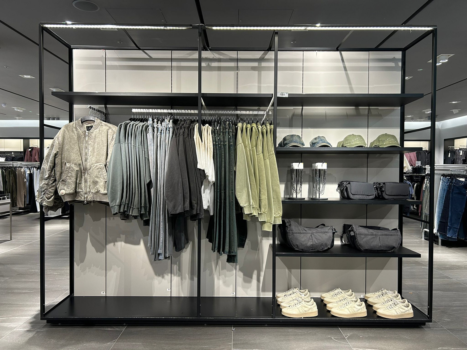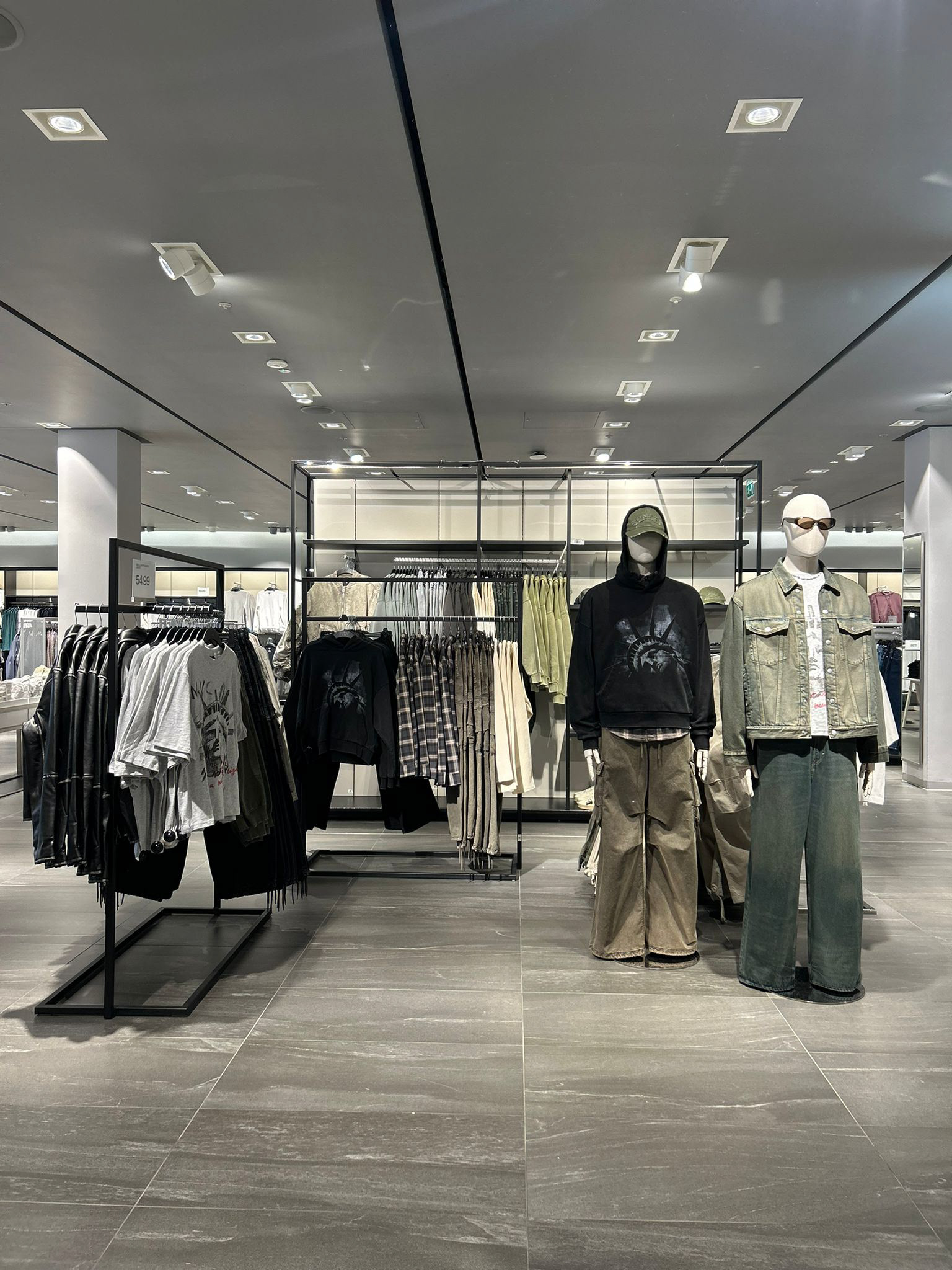This menswear street style display for H&M captures a raw, urban aesthetic defined by rugged elements and a grounded, earthy palette. Mannequins are styled in oversized silhouettes, with washed khaki and green tones creating a laid-back, lived-in feel. Key pieces include distressed wide-leg trousers, layered hoodies, and utility-inspired outerwear, balanced with statement graphics that reinforce the streetwear edge. The surrounding fixtures present a curated mix of casual essentials and textured layers, that highlight versatility while staying authentic to the trend’s roots.